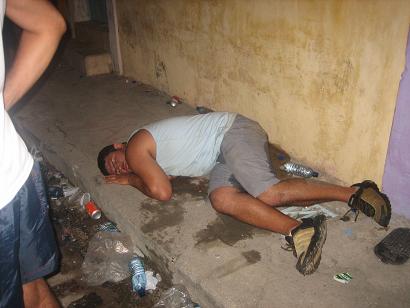 - Un borracho se queda dormido en la acera mientras sus amigos no hacen nada por el.