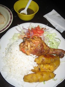 Por 7 bolivianos y medio (85 céntimos) me dan todo lo siguiente: de entrante una pequeña ensalada de lechuga y tomate, un plato de sopa bien abundante, un plato grande con mucho arroz, patatas hervidas, un muslo de pollo, ensalada y unos palitos un poco raros que saben como a boniato; pan y botella individual de coca-cola; de postre, mandarina. Increíble!!! Menos de un euro! Y os puedo asegurar que no es el lugar más barato y que hay muchísimos restaurantes de ese precio.