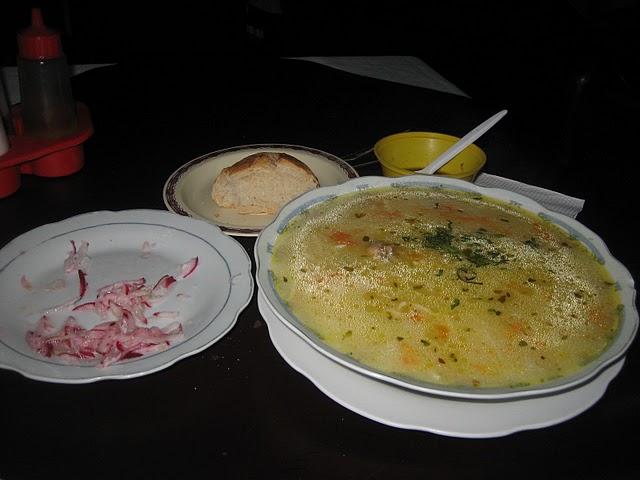 Por la noche, quedo con unos amigos y decido ir a un restaurante barato, puesto que por la noche queremos salir. Así que llegamos al restaurante más barato de La Paz: 4 bolivianos (45 céntimos) por el que nos dan otro buen plato de sopa, y un filete de carne no muy abundante con arroz y ensalada. De postre una taza de té, que no me gusta, pero bueno. Con pan y agua a discreción.
