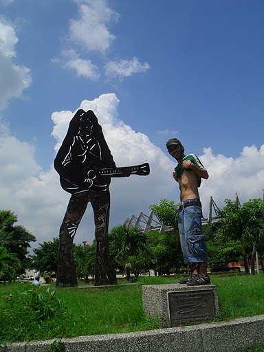 Imitando el contoneo o haciendo el mongol, junto a la estatua de la de los espasmos.