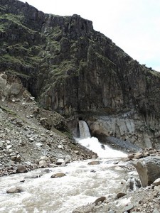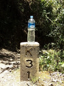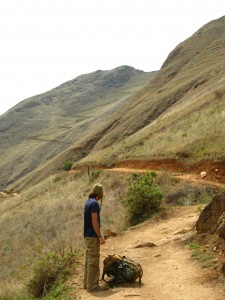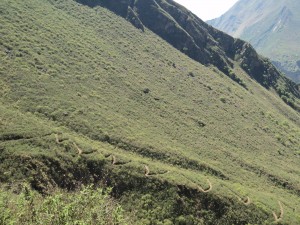 Se sale bordeando los 3000 metros sobre el nivel del mar. La parte más cómoda, los primeros once kilómetros, de falsos llanos tanto descendentes como ascendentes precedía a un interminable descenso de prácticamente diez kilómetros que acababa en un río, a poco más de 1300 msnm. Es decir, de una tacada un desnivel de más de kilómetro y medio, pero como era hacia abajo, acusamos solamente la fatiga de las horas de caminar y el dolor de piernas consecuente con el camino recorrido.