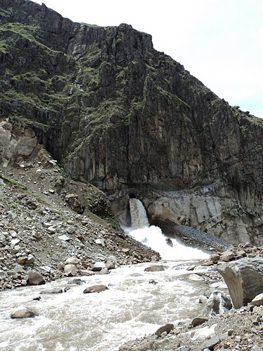 Una cascada saliendo de una roca, una de las cosas que los que no hacen el camino del punki se pierden."Prohibido el paso de peatones por el puente".