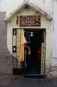 Las dos tiendas de campaña que necesitábamos para nuestra andadura las alquilamos en la más barata de las muchas agencias de alquiler de material de camping que hay por el centro de Cusco. Nos hicieron un precio verdaderamente competitivo, pero como fianza tuvimos que dejar tres pasaportes: el de mis dos compañeros de travesía y el mío.