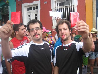 Aqui estamos con nuestro disfraz de arbitros. Tambien se puede ver mi nuevo disfraz facial. Algunos creen que es de Freddie Mercury, otros creen que es de gilipollas. Yo soy del segundo grupo.