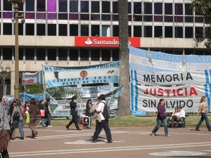 Protesta de los excombatientes de las Malvinas y detrás el omnipresente Banco Santander.